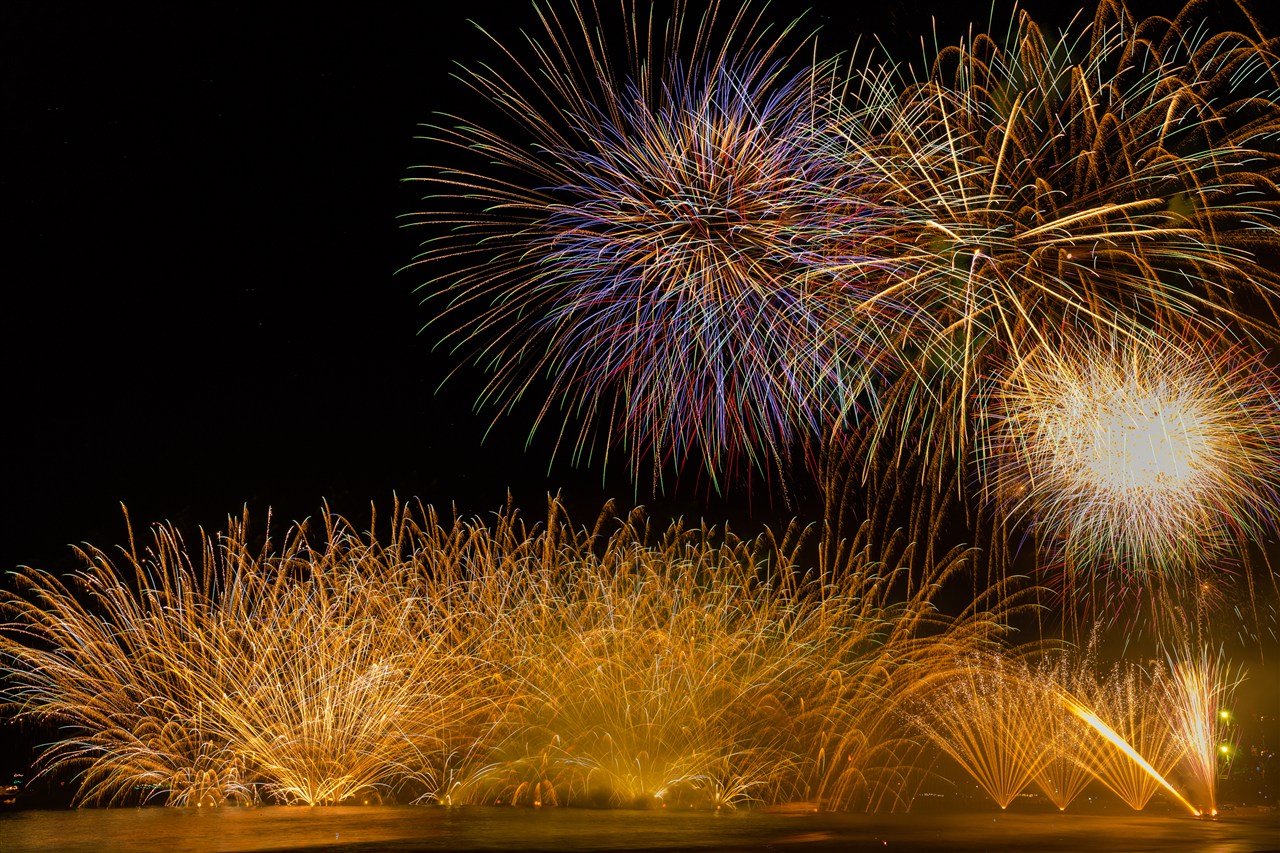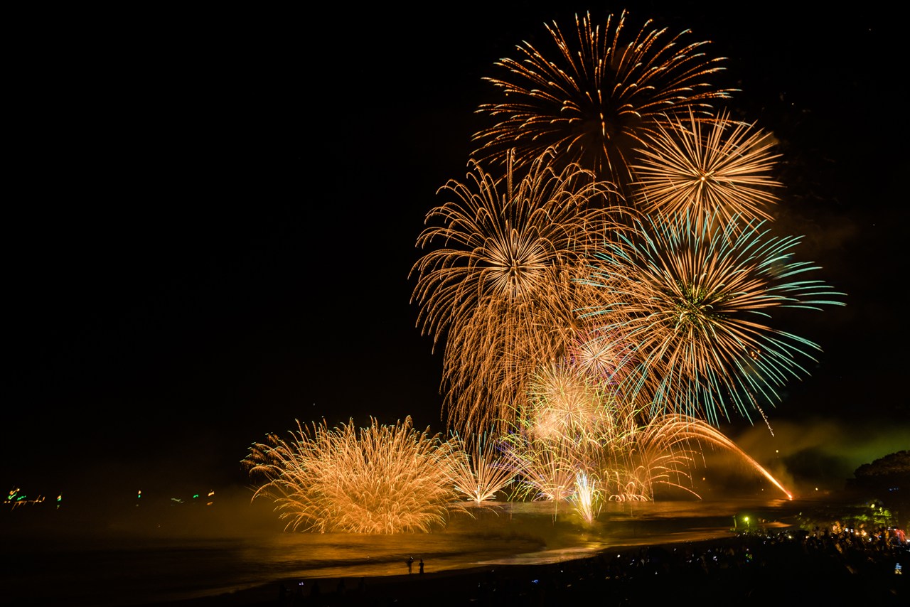 様々な花火大会がありますが、渚百選の弓ヶ浜にて行われるこの花火大会の特徴は、砂浜に座って花火を観賞できるため、ド迫力な海上花火をご体感いただけます。