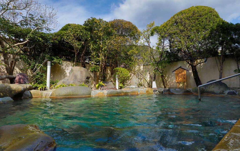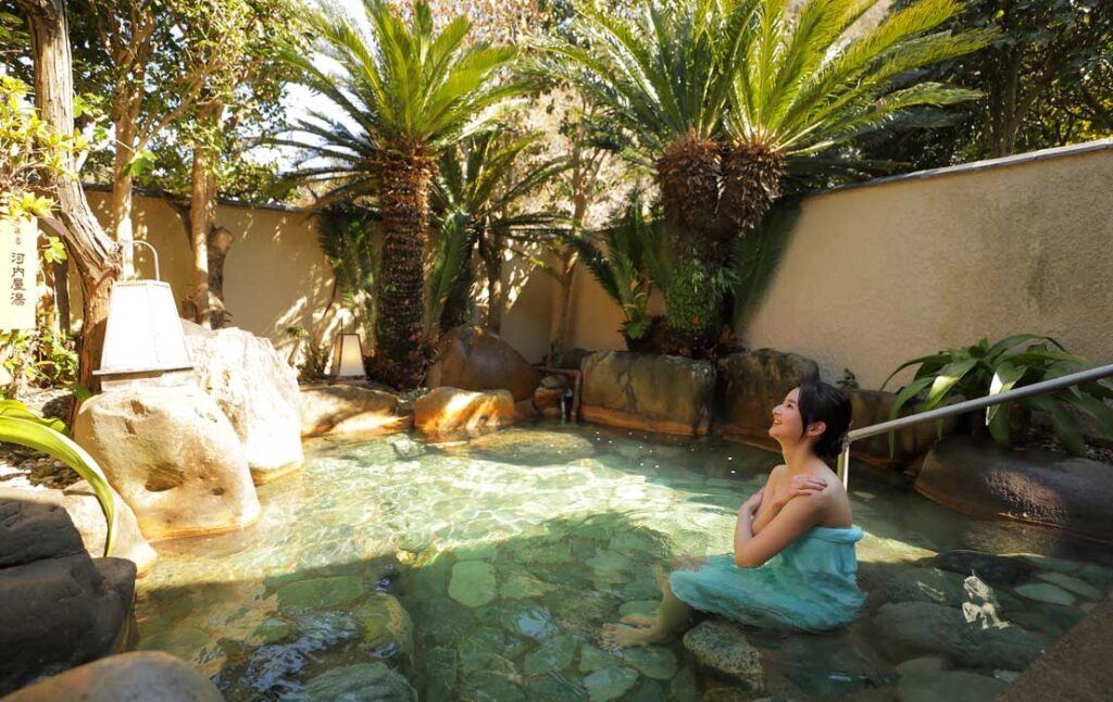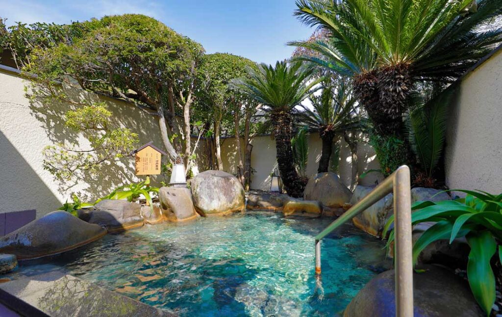 伊豆石を基調にしたかけ流しの露天風呂:貴船と南向けの手すりのある大浴場:桂の2つをお楽しみ頂けます。